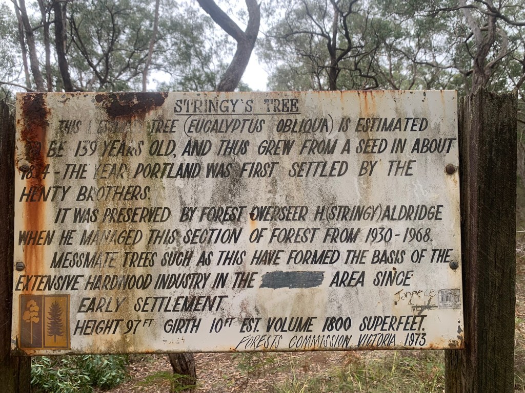 Later, in 1973, local Forest Commission staff from Heywood erected a large interpretive sign at the tree in Stringy’s honour. The sign is looking a bit tired and worn now, although surprisingly, there are no bullet holes in it, and it would be nice to see it refurbished.